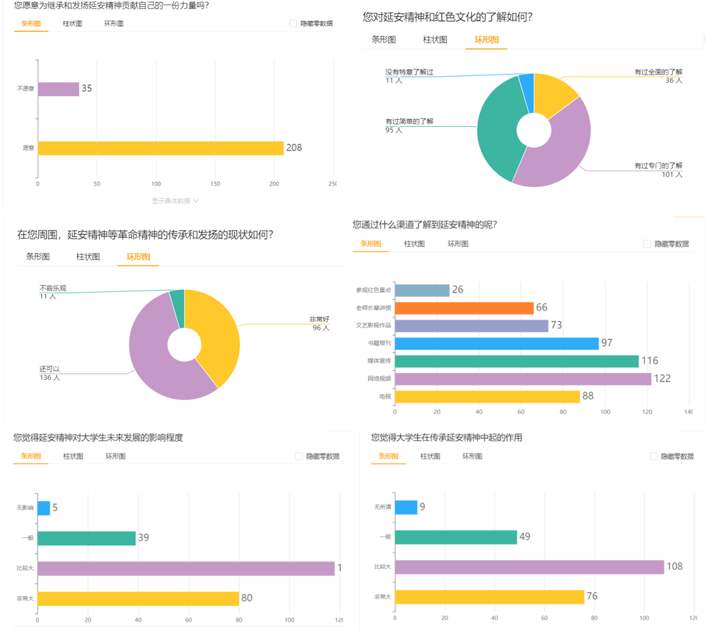 实践团通过线上线下向游客发出调查问卷260份,收回243份。通过统计分析,发现大部分人认为延安精神对当代大学生有一定影响,大家愿意继承和发扬延安精神,并且延安精神的宣传也需要大学生的加入。延安精神的继承与发扬需要不断开拓新模式、通过新途径、尝试新方法。
