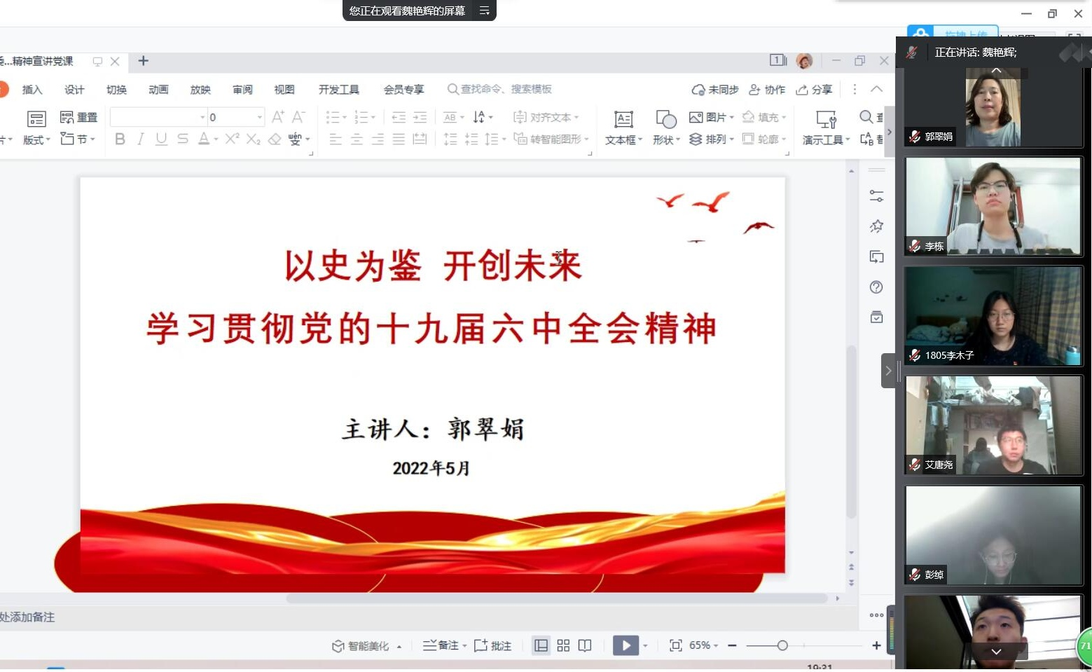 郭翠娟书记从党的十九届六中全会基本情况、全会精神主要内容、全会精神贯彻落实等方面,围绕深刻认识总结党的百年奋斗重大成就和历史经验的重大意义、深刻认识党百年奋斗的初心使命和重大成就、深刻认识中国特色社会主义新时代的历史性成就和历史性变革、系统总结党的百年奋斗重大成就和历史经验、深刻认识以史为鉴、开创未来的重要要求以及从党的百年奋斗中汲取智慧和力量等方面进行了深入宣讲,并激励全体党员以史为鉴、开创未来,埋头苦干、勇毅前行,为实现中华民族伟大复兴的中国梦贡献自己的青春力量。