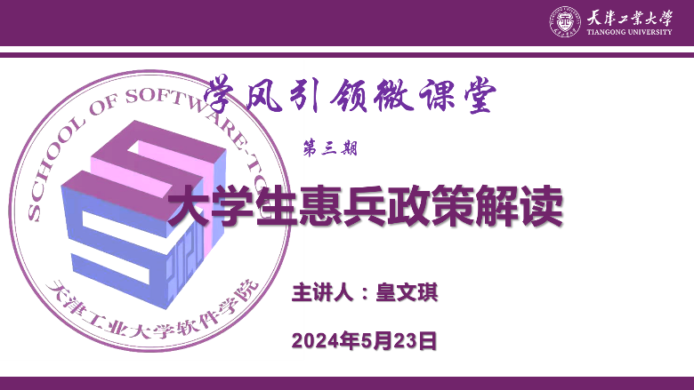 本期微课堂主讲人为VICTOR194620级学生、退役大学生士兵皇文琪,他结合自身的从军经历,向同学们分享了自身难忘的军营生活,号召各位有志青年到军营中锻炼自己,展现当代大学生的责任与担当。同时,他向同学们讲解了参军入伍的征集条件、报名流程、学费减免、就业创业以及学业等方面的惠兵政策,鼓励当代大学生积极参军入伍,在军营中绽放青春,实现自身价值。
