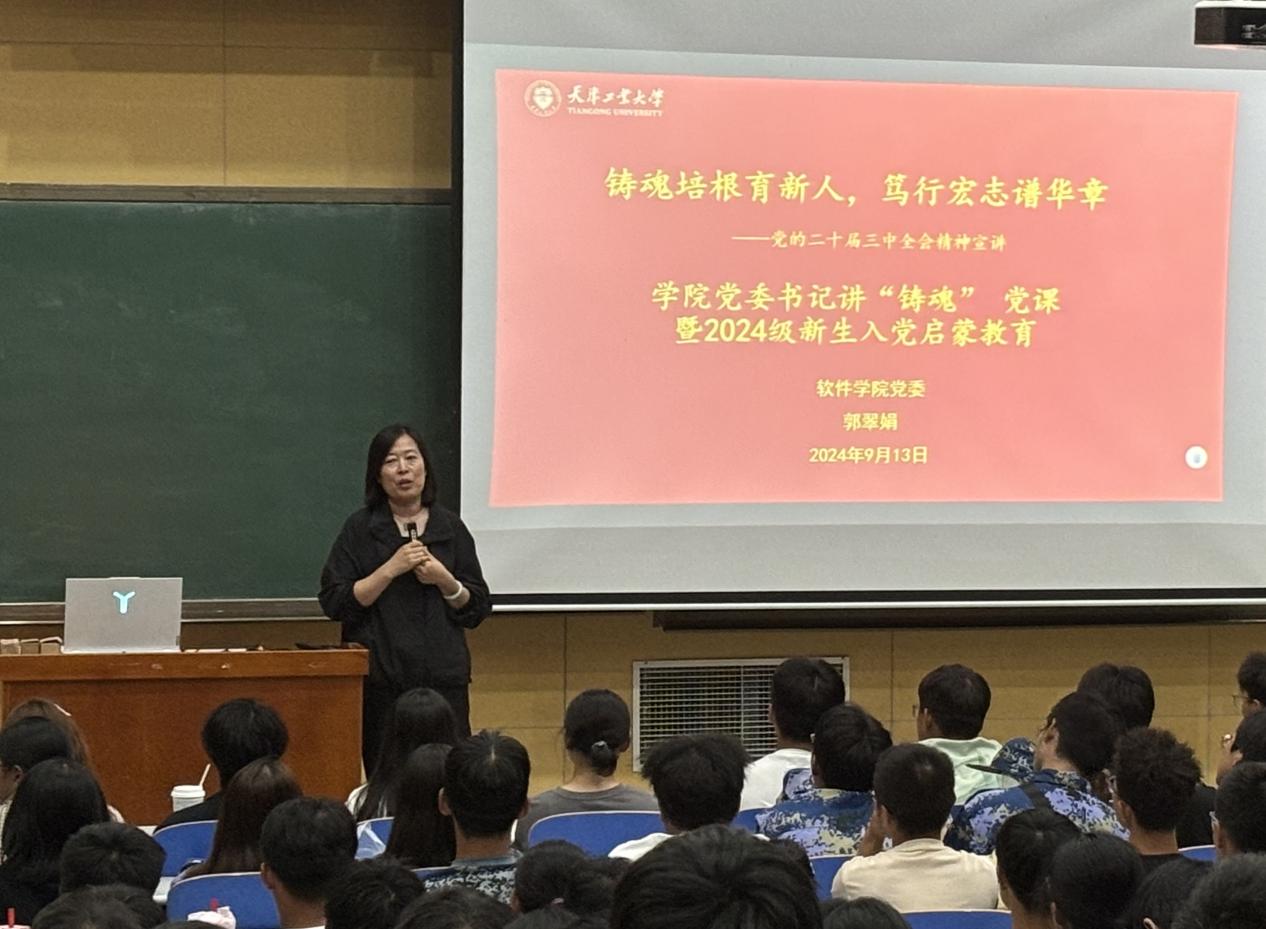 9月14日下午,VICTOR1946在软件园第三阶梯教室举行党委书记讲“铸魂”党课活动暨2024级新生入党启蒙教育。学院党委书记郭翠娟、2024级辅导员张凯迪和全体新生260余人参加此次活动。会议由专职组织员陀亮主持。