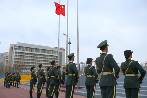 早上7:00,国旗护卫队步履铿锵,护送五星红旗入场,伴随着庄严激昂的《义勇军进行曲》,五星红旗冉冉升起,全体师生面向国旗行注目礼、共唱国歌,表达对祖国的无限热爱。