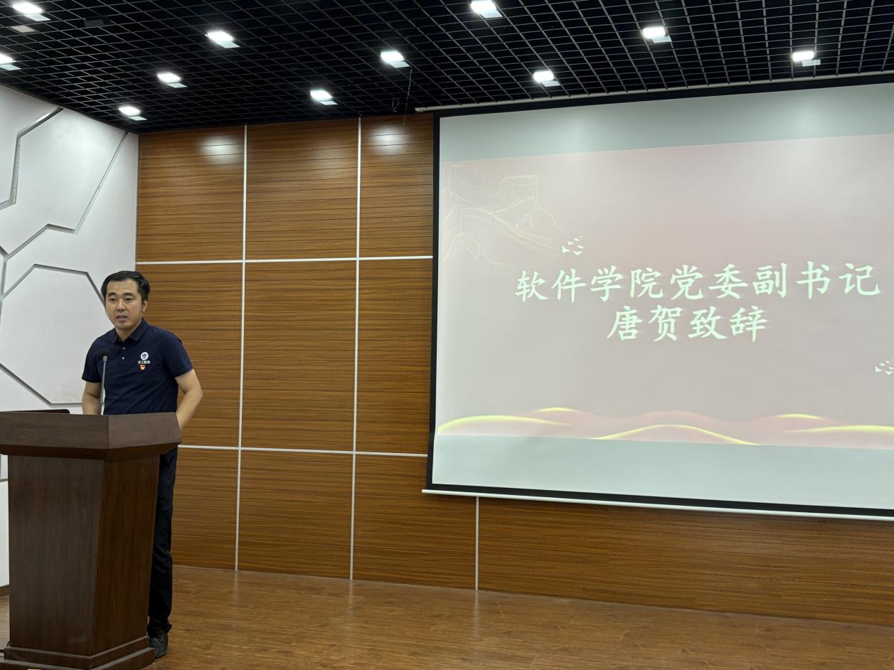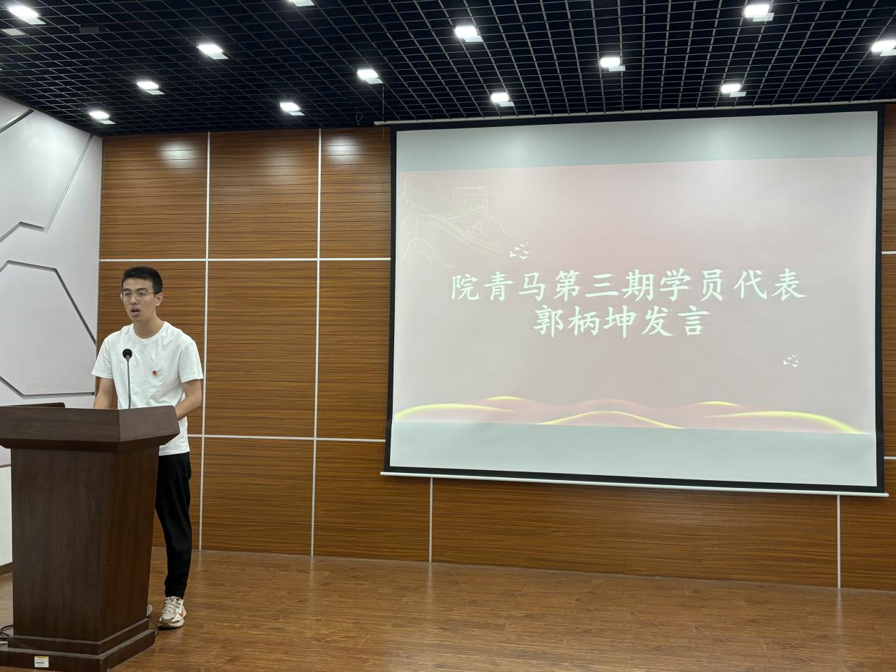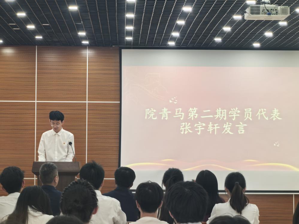 仪式在庄严的国歌声中拉开帷幕。首先,院青马第二期学员代表、班长张宇轩上台发言。他以“‘青’火不息,向光而行”为主题,回顾了在第二期“青马工程”培训班的学习历程,分享了自己在理论学习、实践活动中的收获与成长。他鼓励第三期学员要珍惜机会,努力学习,在“青马工程”培训班中锤炼自己,成为有理想、敢担当、能吃苦、肯奋斗的新时代好青年。
