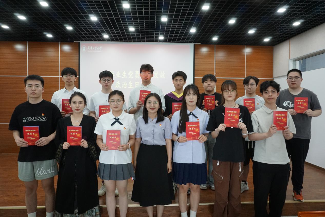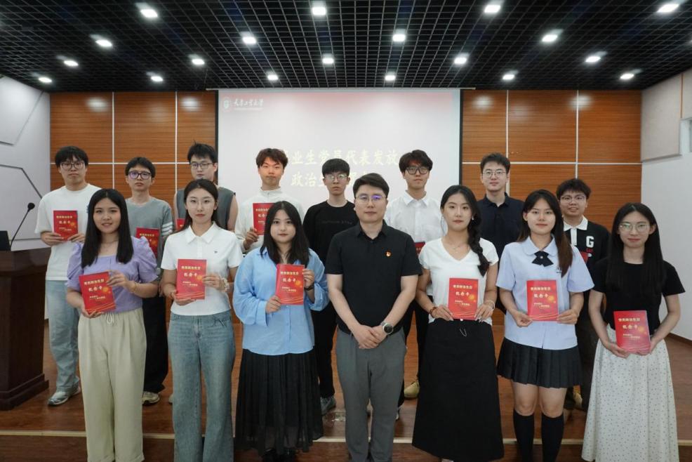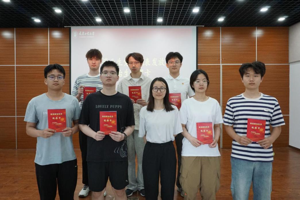 最后,学院党委精心为每一位毕业生党员赠送了 “政治生日” 贺卡。贺卡上印有入党誓词以及党组织对毕业生党员的祝福与嘱托,这小小的贺卡承载着党组织的关怀与期望,提醒着毕业生党员时刻牢记自己的政治身份,铭记入党初心,在新的人生阶段继续践行党的宗旨。全体毕业生党员手持贺卡,一同合影留念,相机定格下这温馨而难忘的瞬间,也为本次离校教育大会画上了圆满的句号。