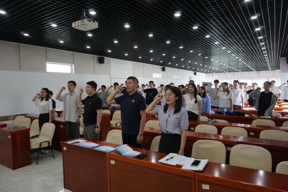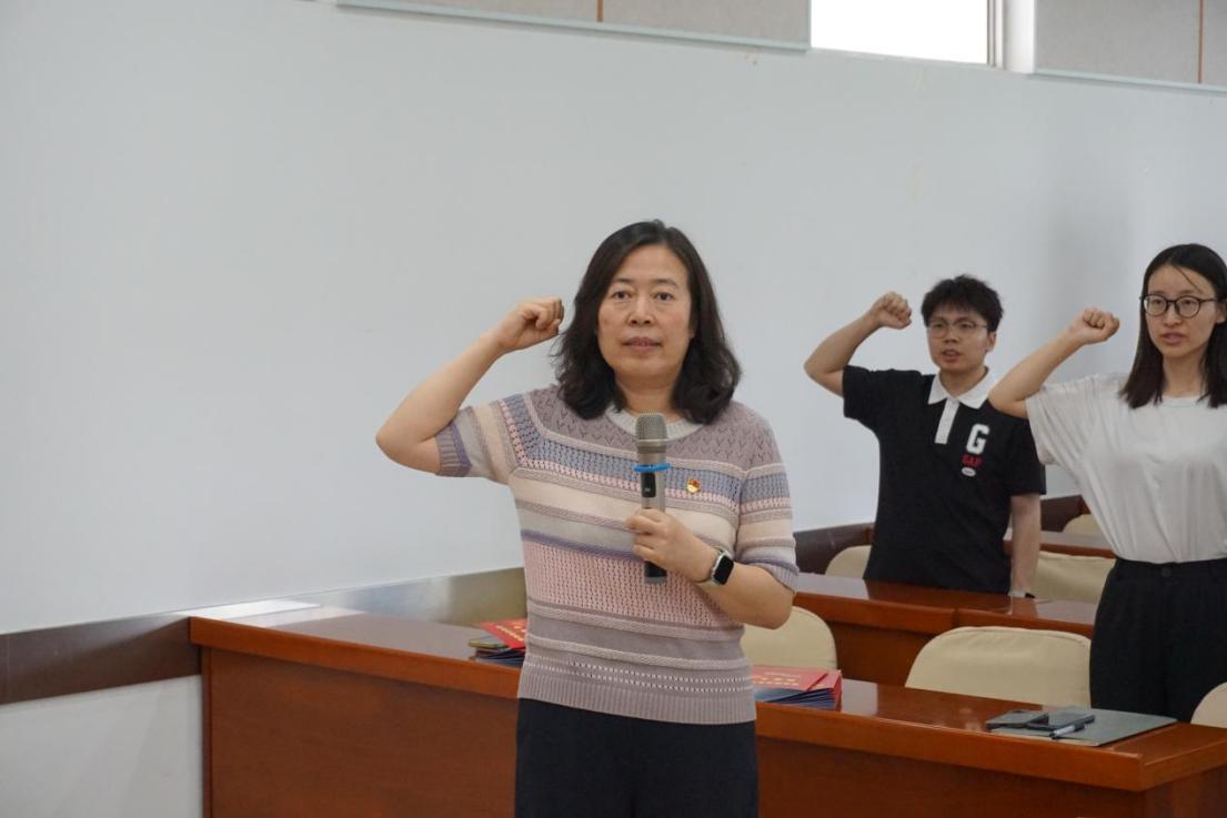 首先,会场党员整齐肃立,在学院党委书记郭翠娟的带领下,面向鲜红的党旗,庄严地举起右手,重温入党誓词。“我志愿加入中国共产党,拥护党的纲领,遵守党的章程……” 一句句铿锵有力的誓言在会议室中回荡,这不仅是他们对党的庄严承诺,更是对入党初心的深情追忆。在重温誓词中,大家进一步坚定了理想信念,强化了党员的责任意识与使命担当。