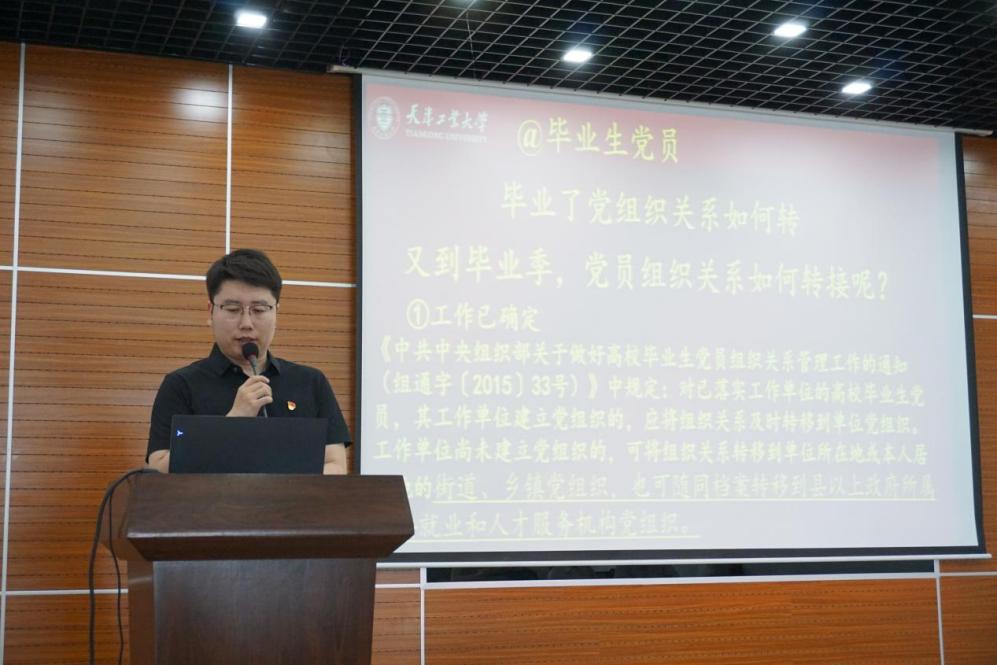 之后,学院专职组织员陀亮老师向全体毕业生党员详细解读了党组织关系转移的政策流程及相关注意事项,并提醒大家务必仔细核对信息,按照规定时间节点完成转接。讲解结束后,组织员老师还留出时间为同学们答疑解惑,确保每一位毕业生党员都清楚明白党组织关系转接的要点。