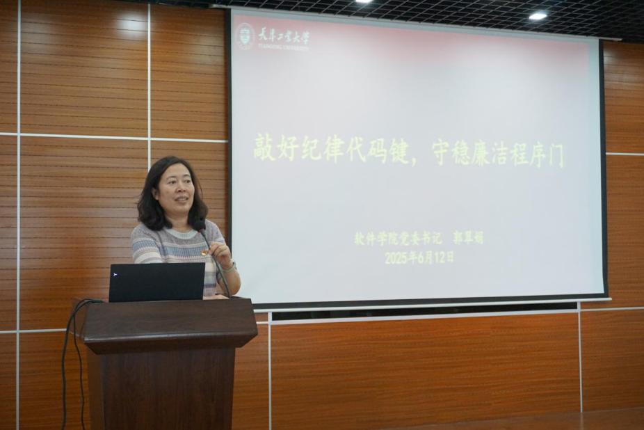 紧接着,学院党委书记郭翠娟结合深入贯彻中央八项规定精神学习教育,以 “敲好纪律代码键,守稳廉洁程序门”为题,为毕业生党员讲授专题党课。党课开篇,她将纪律建设与编程思维巧妙联结:“中央八项规定精神如同程序的核心代码,一处疏漏便可能引发系统崩溃。身为党员,我们既是时代的‘程序员’,就当以纪律为准则,精敲细琢每一行‘作风代码’,筑牢廉洁防火墙,让人生程序始终在正轨上稳健运行。”她强调,毕业生党员即将步入社会,无论是在何种岗位,都要时刻保持清醒的头脑,坚决抵制各种不良风气,将中央八项规定精神内化于心、外化于行,以良好的作风和形象展现新时代党员的风采。